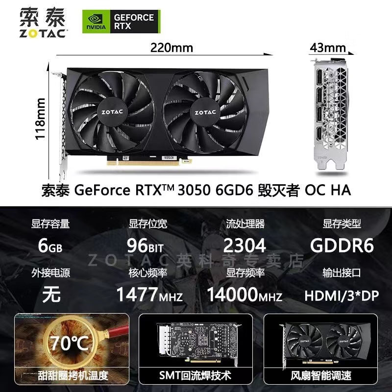索泰(ZOTAC) RTX3050 6G D6 毁灭者 电脑游戏/电竞显卡 台式机独立显卡
