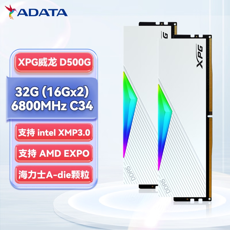 威刚XPG D500G 32G(16G*2) 6800 DDR5 DW500G (釉白) RGB 台式机内存条 海力士A-die