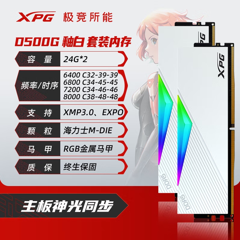 威刚XPG D500G 48G(24G*2) 6800 DDR5 DB500G (白)RGB灯条台式电脑海力士A-DIE颗粒