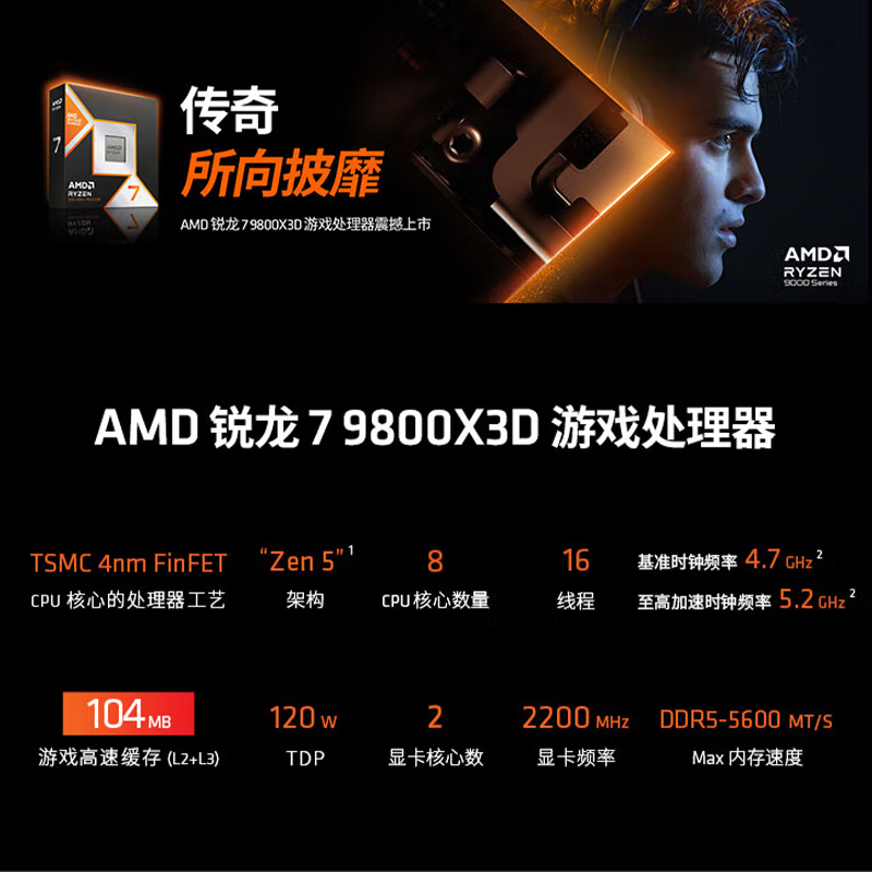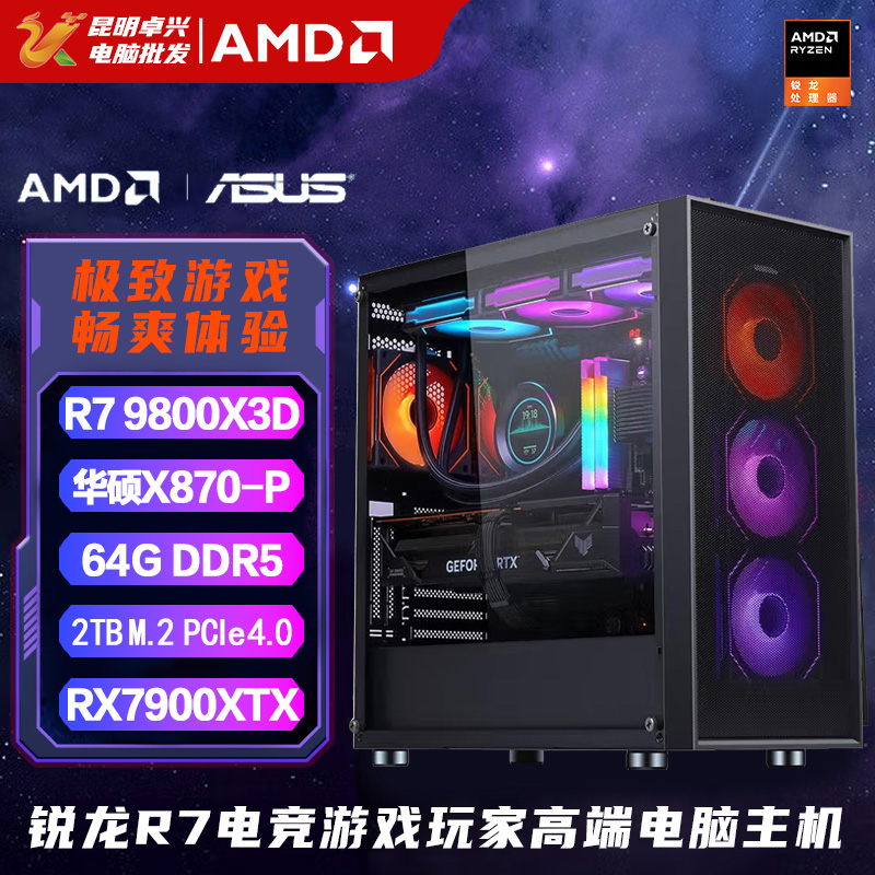 【锐龙R7 9800X3D 游戏电竞】锐龙R7-9800X3D/华硕X870/64G/2TB固态/RX7900XTX电竞游戏设计主机