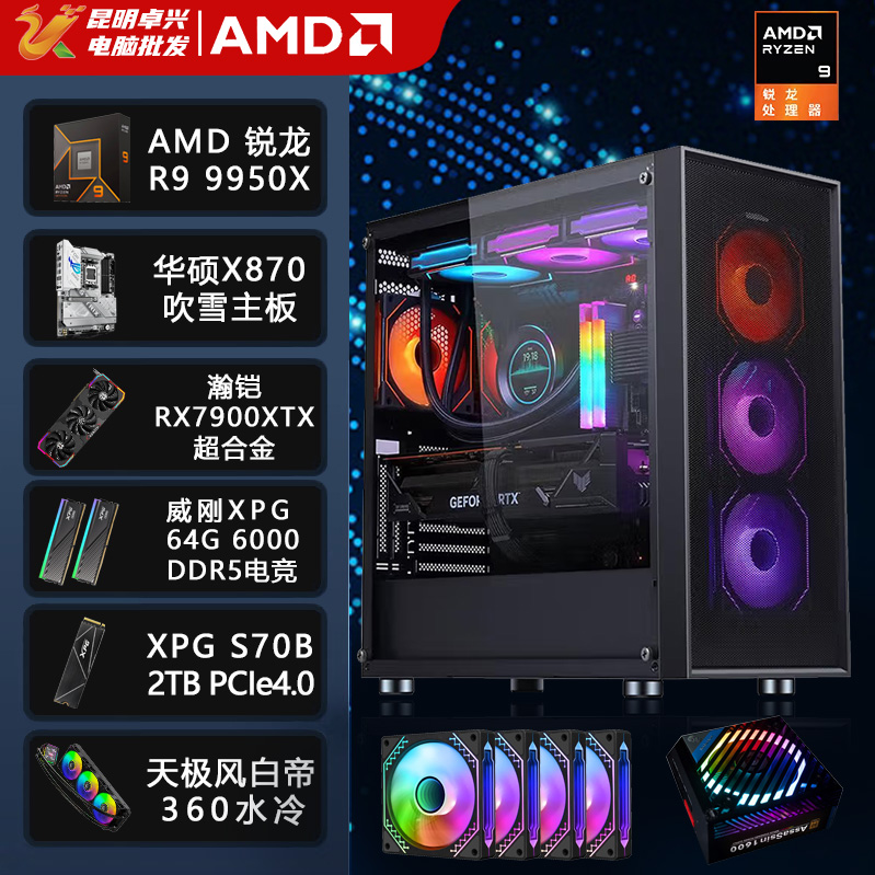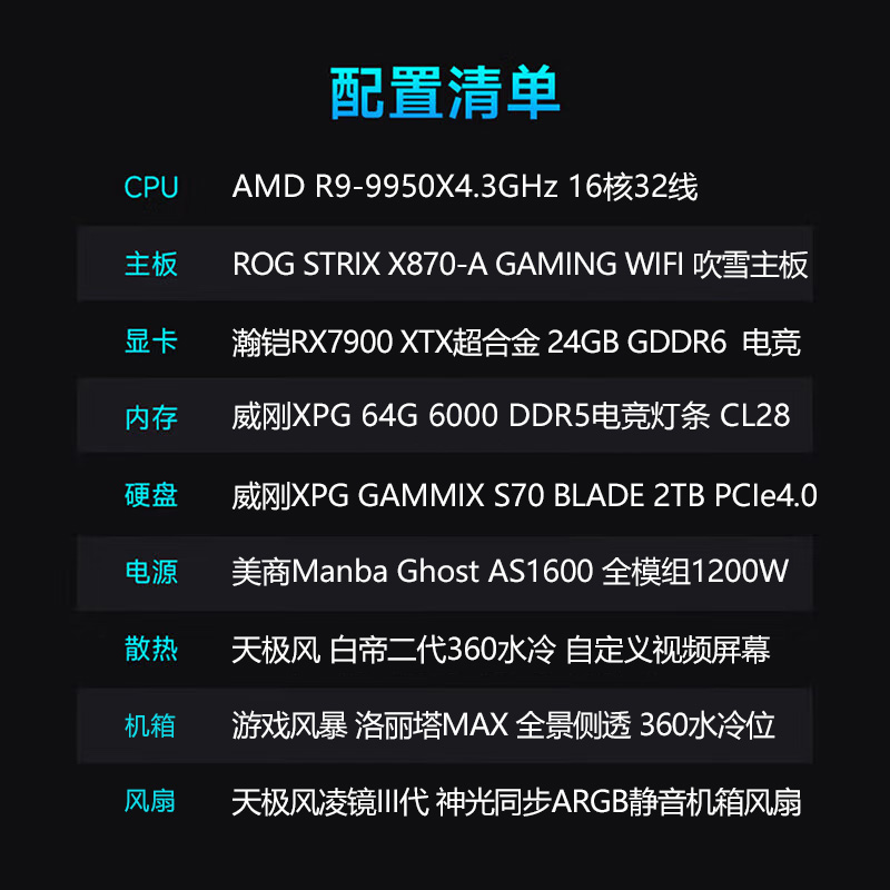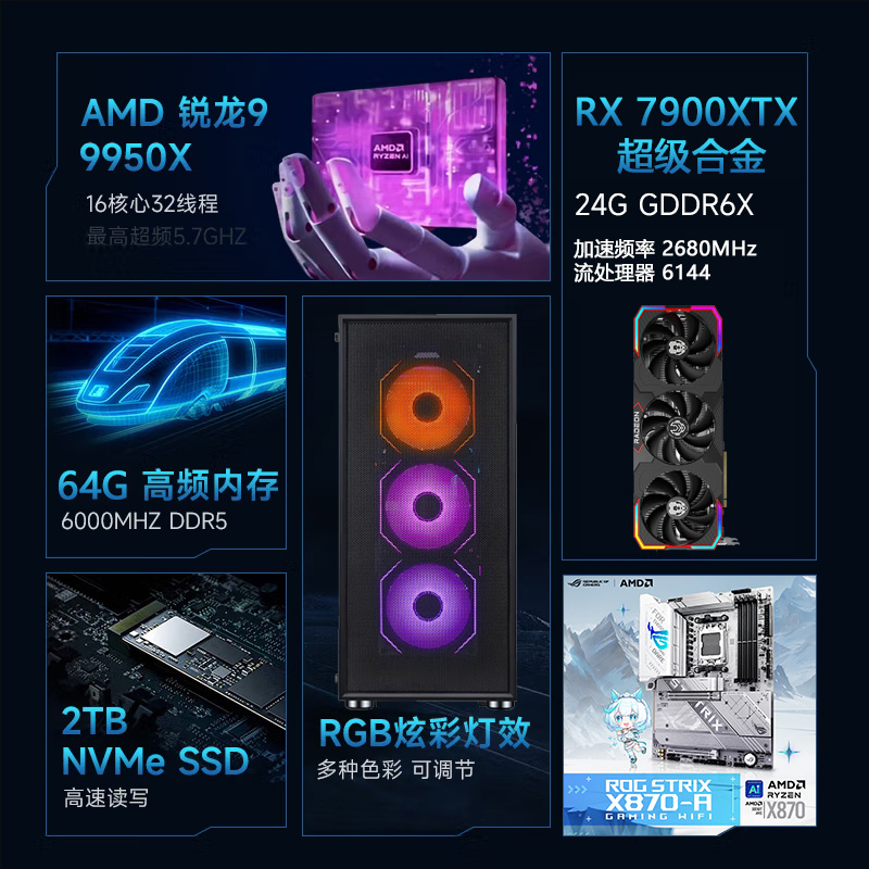 【锐龙R9 9950X游戏电竞】 锐龙R9-9950X/华硕X870吹雪/64G/2TB固态/RX7900XTX 电竞游戏主机