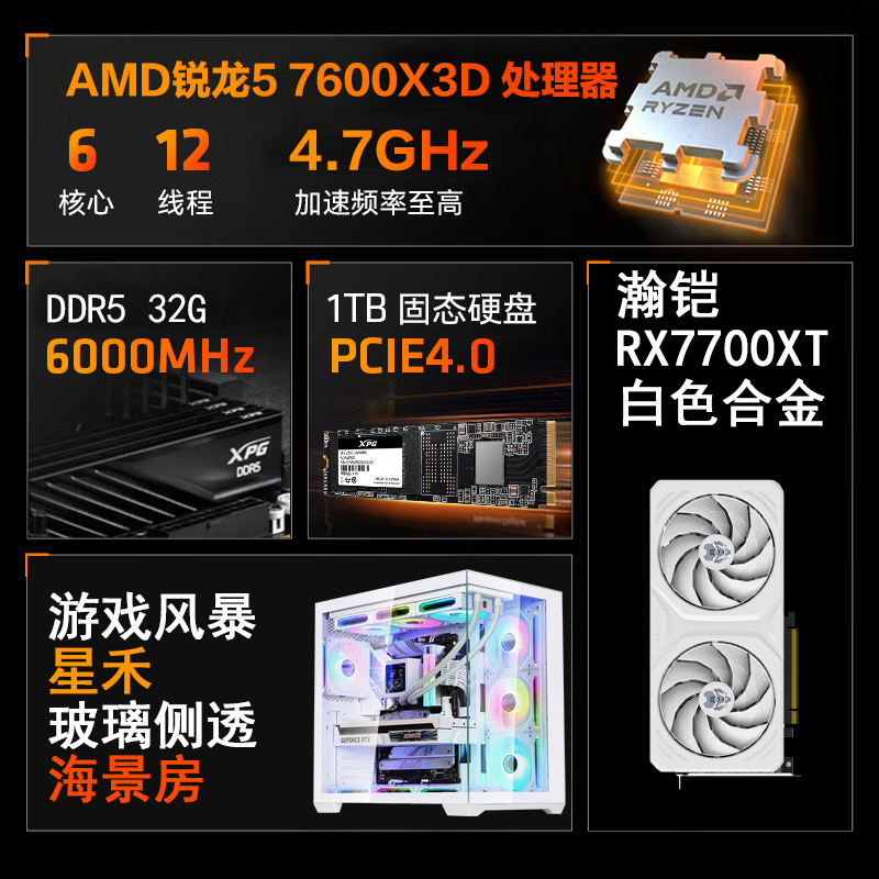 【锐龙R5 7600X3D游戏电竞】锐龙R5-7600X3D /华硕B650M/32G/1TB/RX7700XT电竞游戏电脑主机