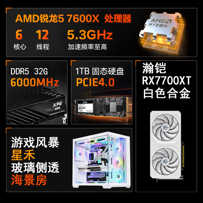 【锐龙R5 7600X游戏电竞】锐龙R5-7600X/华硕B650M/32G/1TB/RX7700XT电竞游戏电脑主机
