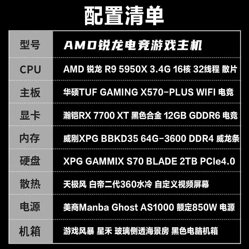 【锐龙R9 5950X游戏电竞】锐龙R9-5950X/华硕X570/64G/2TB/RX7700XT电竞游戏电脑主机