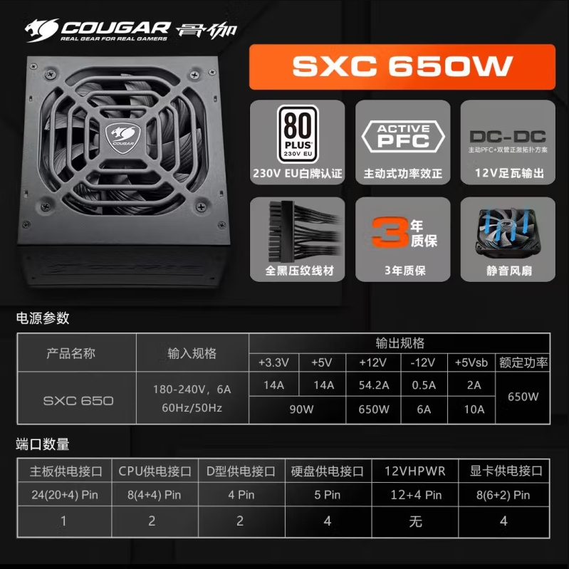 骨伽 SXC650黑色 额定650W 白牌直出 静音宽幅电脑主机电源