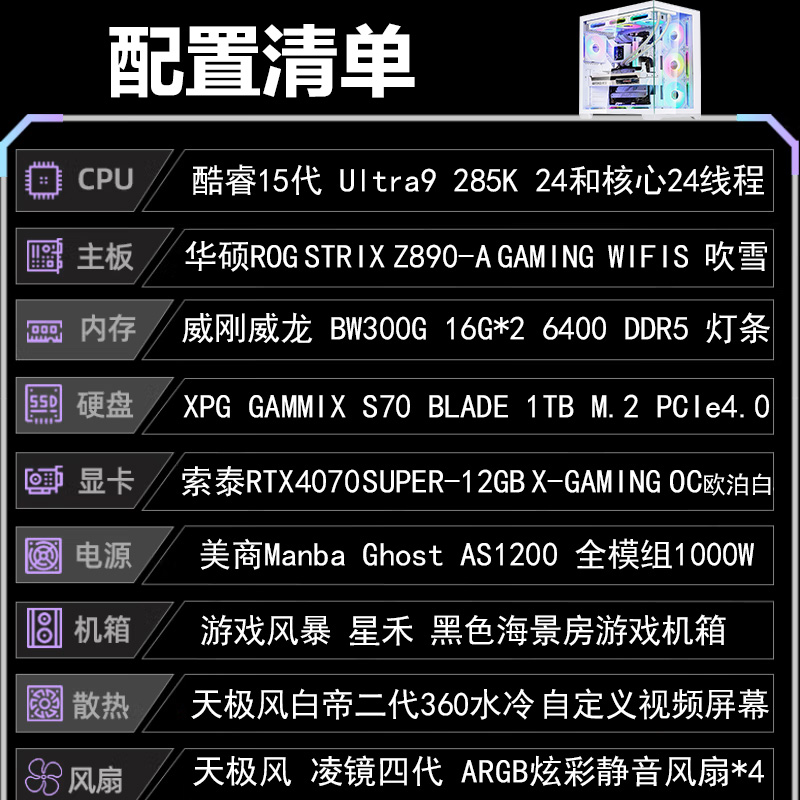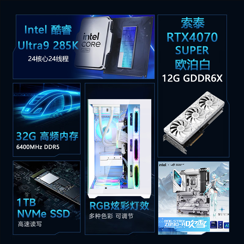 【酷睿Ultra 9 285K主机】酷睿Ultra 9 285K/Z890/32G/1TB/RTX4070S电竞游戏台式电脑主机