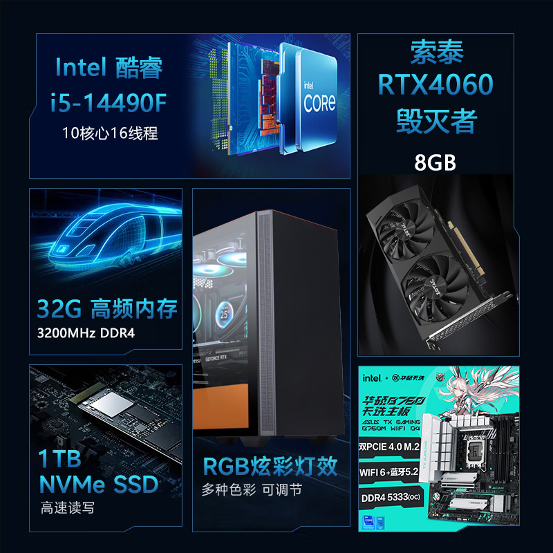 【酷睿i5 14490F主机】酷睿i5 14490F/B760M/32G/1TB/RTX4060电竞游戏主机