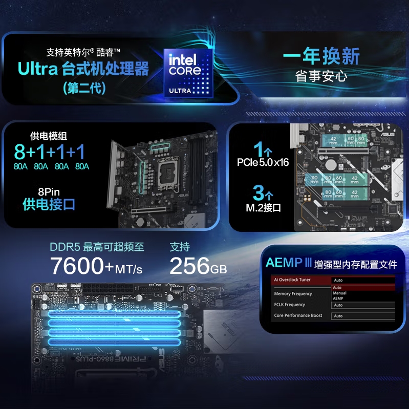 华硕PRIME B860-PLUS主板 支持 CPU 245KF/230/225 (Intel B860/LGA 1851)