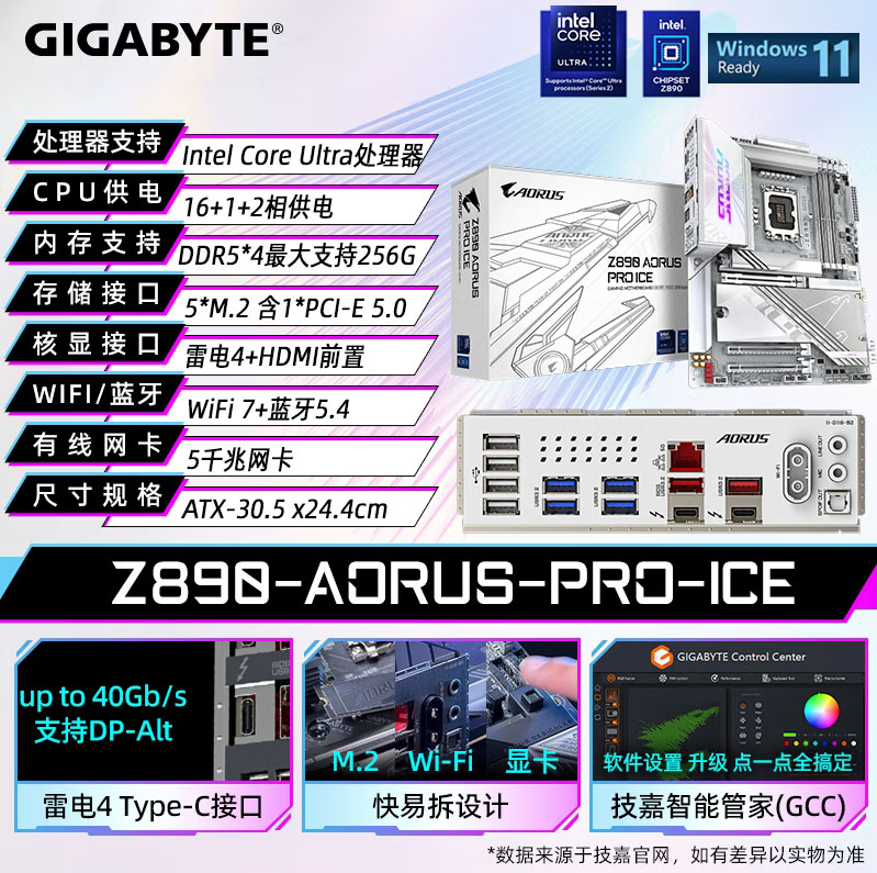 技嘉(GIGABYTE)电竞冰雕Z890 AORUS PRO ICE DDR5主板 支持CPU Ultra U9-285K