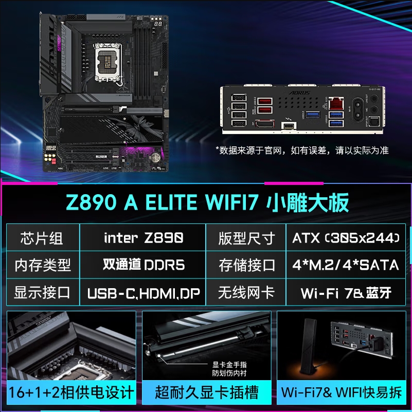技嘉(GIGABYTE)小雕Z890 AORUS ELITE WIFI7 DDR5主板 支持CPU Ultra U9-285K