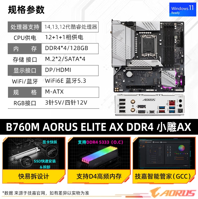 技嘉 B760M A ELITE AX DDR4 小雕主板 支持12/13/14代CPU