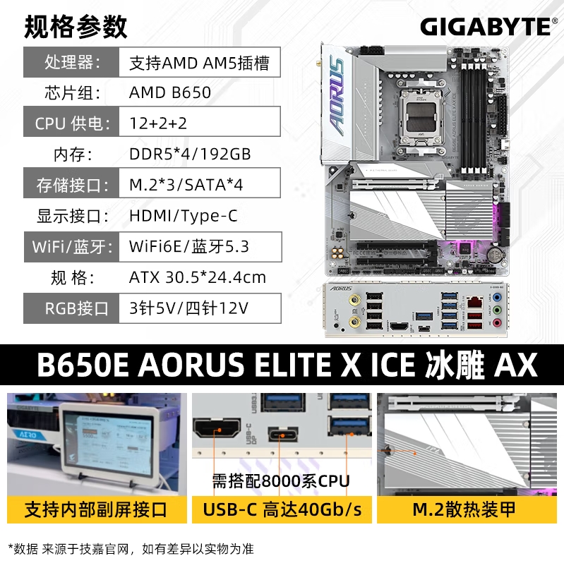 技嘉(GIGABYTE)冰雕B650E AORUS ELITE X AX ICE主板DDR5支持AMD CPU AM5