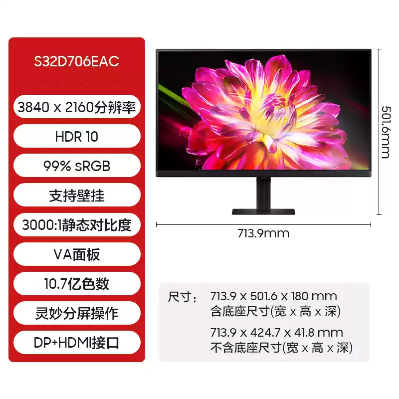 三星 32英寸 S32D706EAC 4K高清智慧护眼PBP分屏专业设计渲染建模绘图显示器