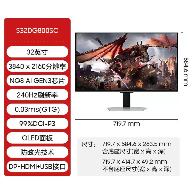 三星 32寸 S32DG800SC 4K 240HZ OLED电竞游戏平面显示器