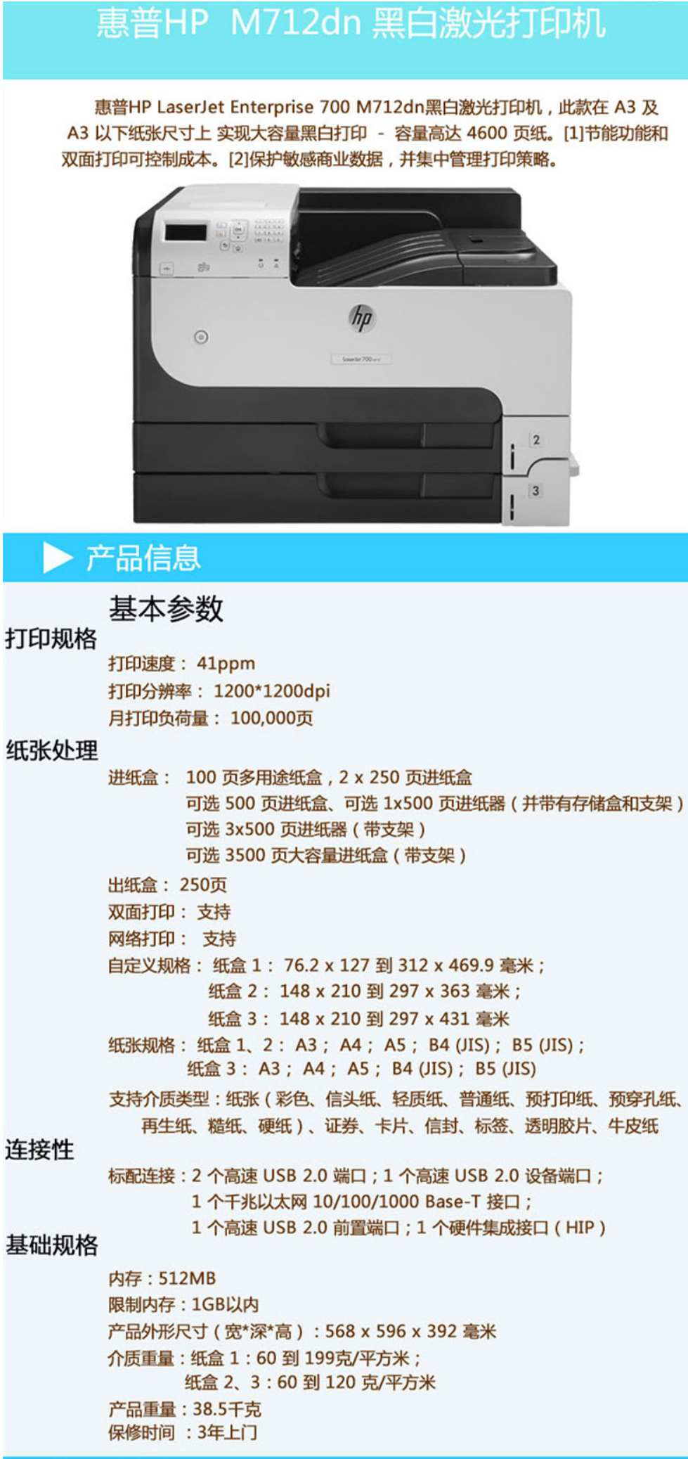 惠普(HP)LaserJet Enterprise M712dn A3黑白激光打印机