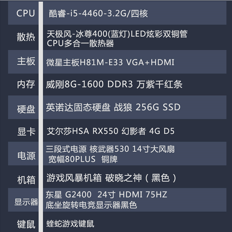 主要配置:i5-4460/微星h81M/威刚8G内存/256G固态/4G游戏显卡/电竞机箱/24寸电竞显示器/蝰蛇游戏键鼠